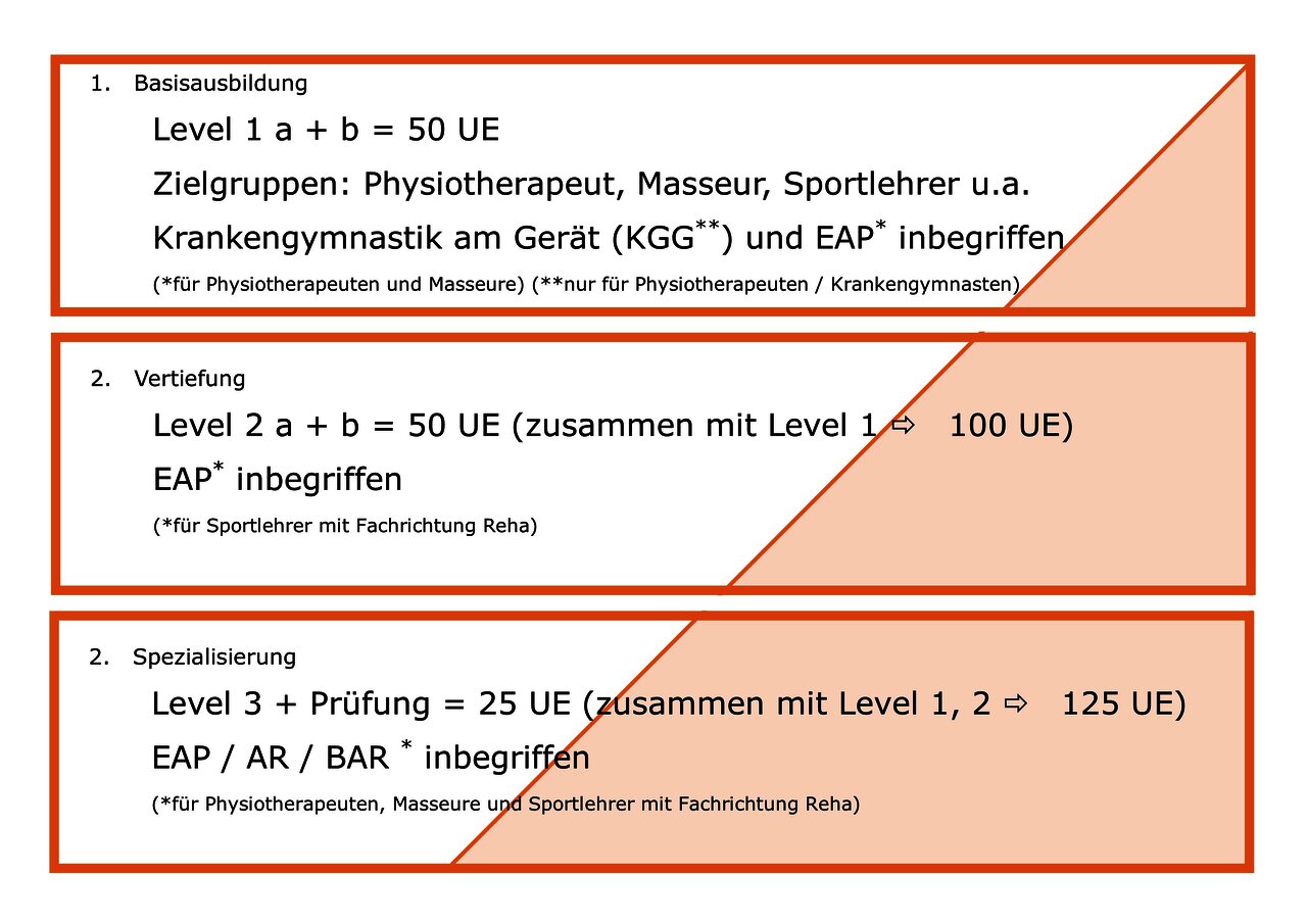 Für die EAP/AR - Zulassung sind zudem notwendig: Je 30 Unterrichtseinheiten Sportphysiotherapie und KG-Techniken.