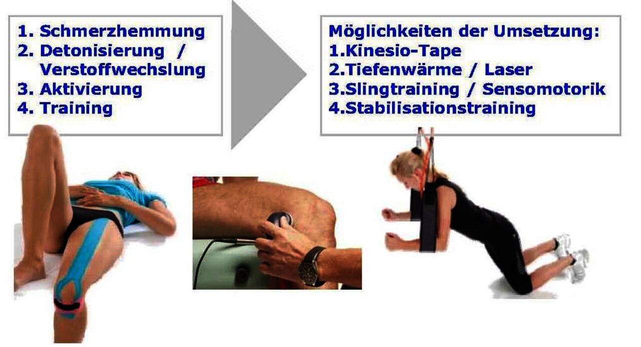 Das REHAPE®-Konzept ist bekannt als eine effektive und zeitsparende Therapiemethode in der Physiotherapie. Es beruht auf einer raschen Schmerzlinderung durch Tiefenwärme und/oder Laser und der darauffolgenden Aktivierung der lokalen Stabilisatoren mittels Slingtraining.