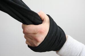 Es ist zu einer kleinen Schlinge zusammengelegt und mehrfach solide vernäht. Mit Hilfe dieser Schlinge lässt sich der Sling Trainer bequem an einem Schaukelhaken in der Decke befestigen. Oder an einem Türanker. Oder an einem Baum. Oder einer anderen Deckenaufhängung.